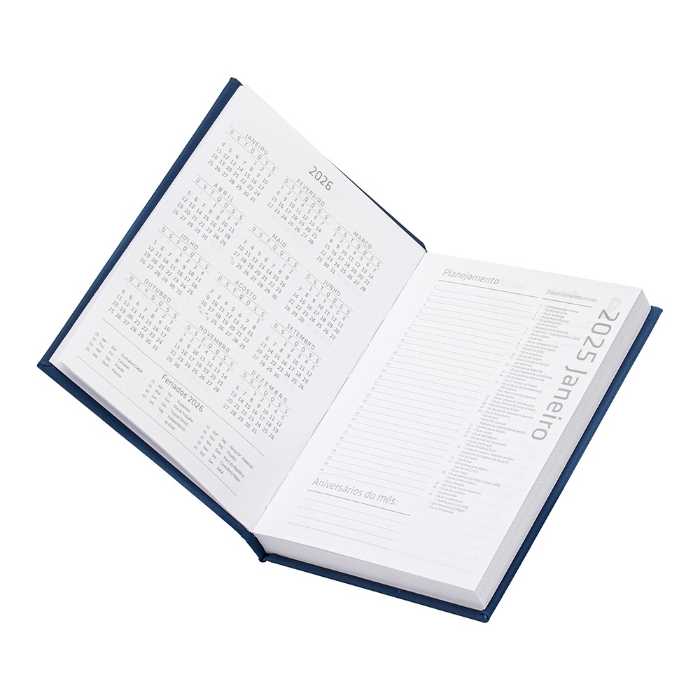 Agenda 2025 com capa emborrachada, contém páginas para dados pessoais, calendários de 2024 à 2026, planejamento e anotações.