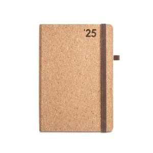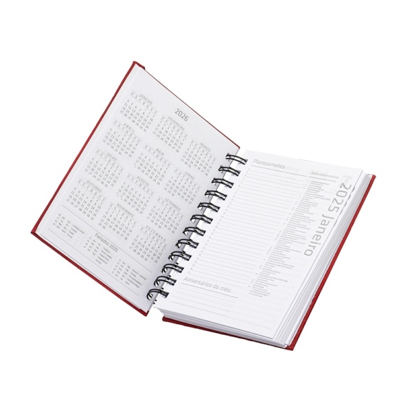 Agenda 2025 com capa emborrachada e wire-o metálico. Contém páginas para dados pessoais, calendários de 2024 à 2025 e planejamento.