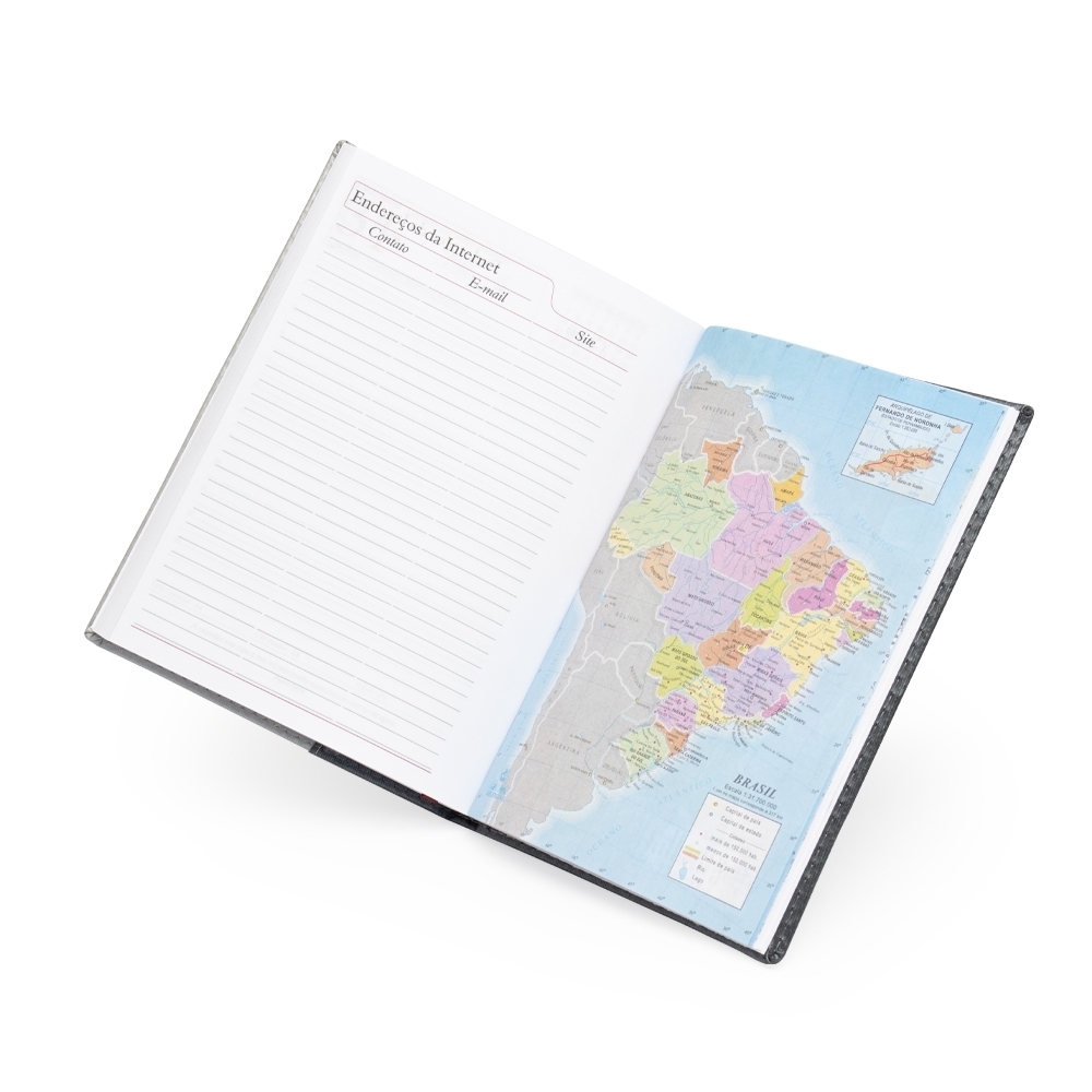 Agenda diária 2024 de couro sintético. Contém fita de cetim marca página, dados pessoais, calendário de 2023 à 2025, mapa do Brasil, mapa global, índice telefônico e planejamento. OBS.: PEDIDOS APENAS MÚLTIPLOS DE 10 PEÇAS!