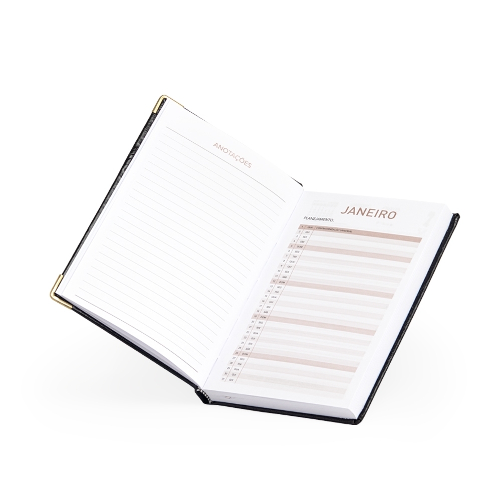 Agenda diária 2025 de couro sintético. Contém fita de cetim marca página, dados pessoais, calendário de 2024 à 2026, mapa do Brasil, mapas, índice telefônico e planejamento.
