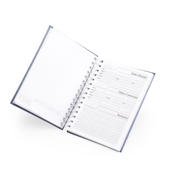 Agenda diária 2025 metalizada em Percalux com wire-o metálico. Possui “bolso” plástico atrás da capa, páginas de dados pessoais, calendário 2024 a 2026, mapa do Brasil, mapa-múndi, índice telefônico e planejamento.