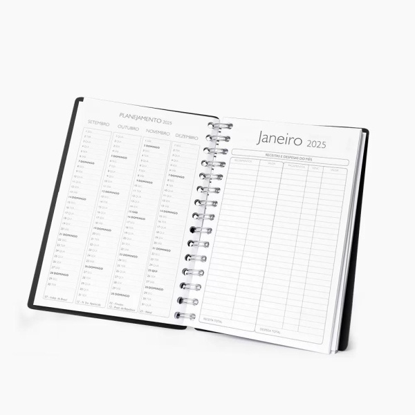 Agenda diária 2025 com espiral, material plástico para lacre. Contém folha com bolso duplo, folhas para preenchimento de dados pessoais, calendários 2024 a 2026, planejamento, receitas e despesas mensais, agenda telefônica, mapa do Brasil, mapa mundi e acompanha régua marca página de papel com 15 cm.