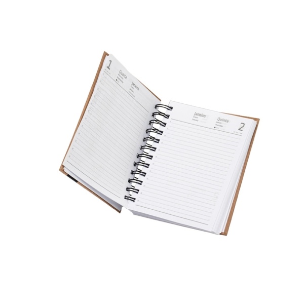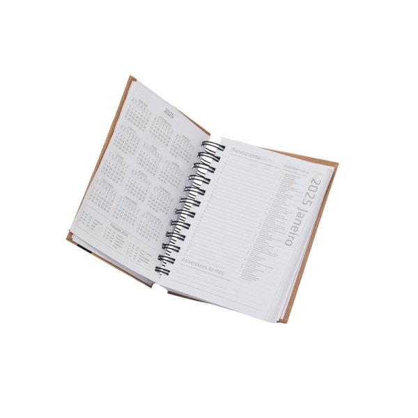 Agenda diária 2025 com espiral, material kraft, capa dura. Contém aproximadamente 169 folhas, entre elas, páginas de dados pessoais, calendário 2024 a 2026, planejamento e aniversários do mês.
