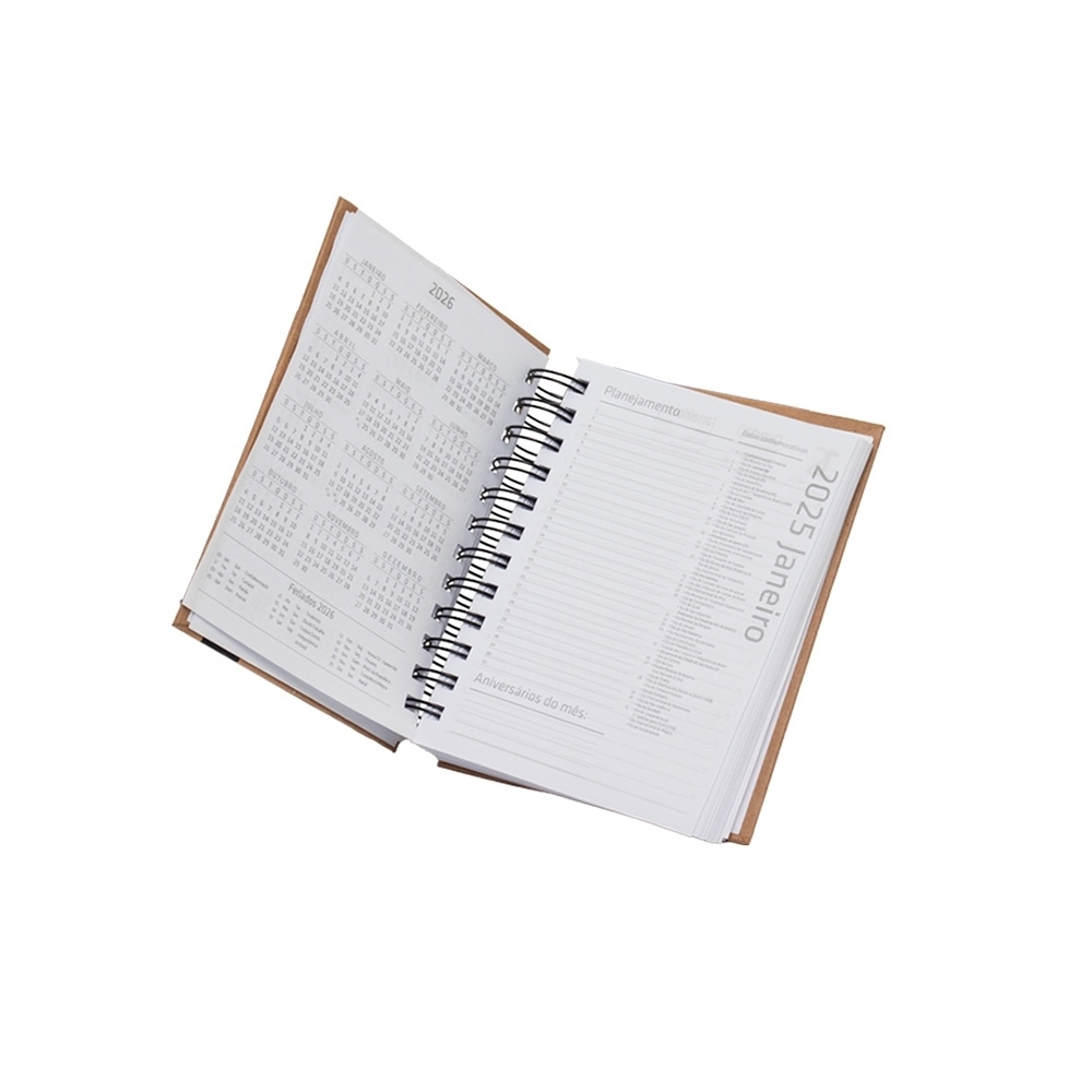 Agenda diária 2025 com espiral, material kraft, capa dura. Contém aproximadamente 169 folhas, entre elas, páginas de dados pessoais, calendário 2024 a 2026, planejamento e aniversários do mês.
