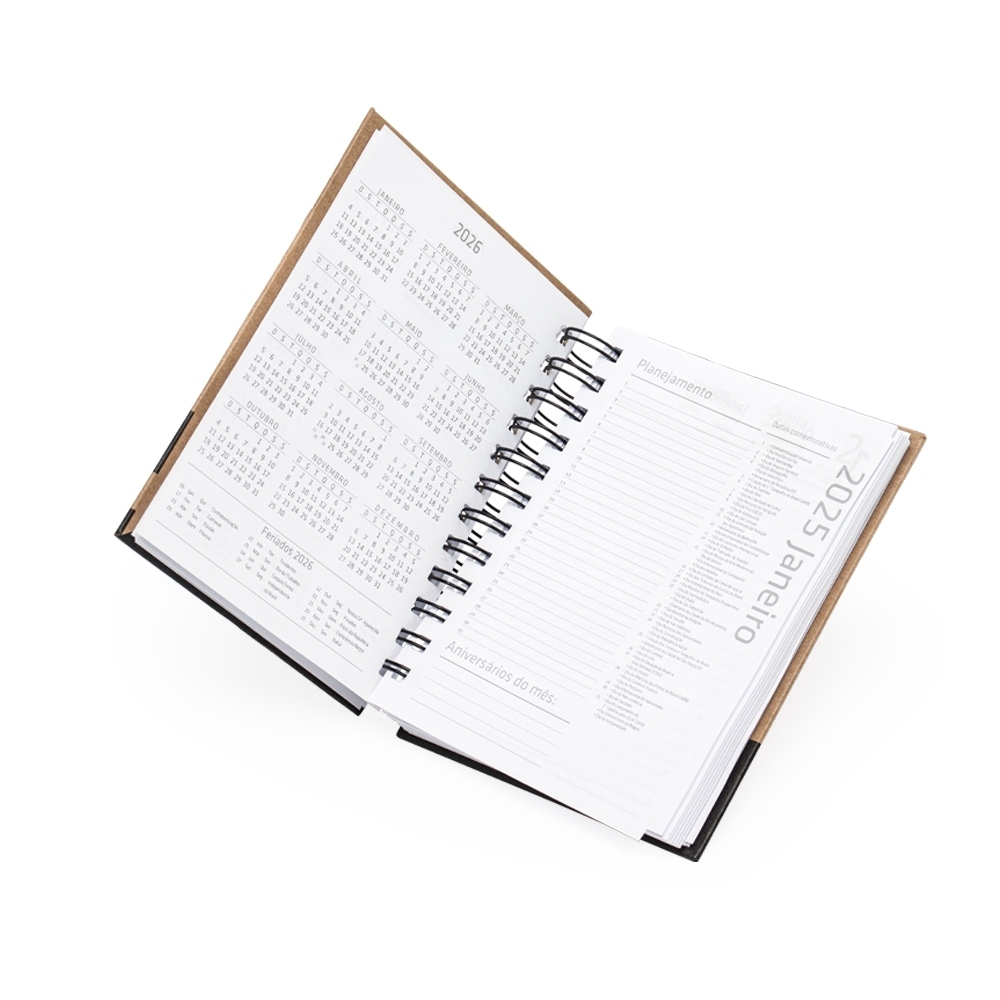 Agenda diária 2025 com espiral, material kraft, capa dura. Contém aproximadamente 169 folhas, entre elas, páginas de dados pessoais, calendário 2024 a 2026, planejamento e aniversários do mês.