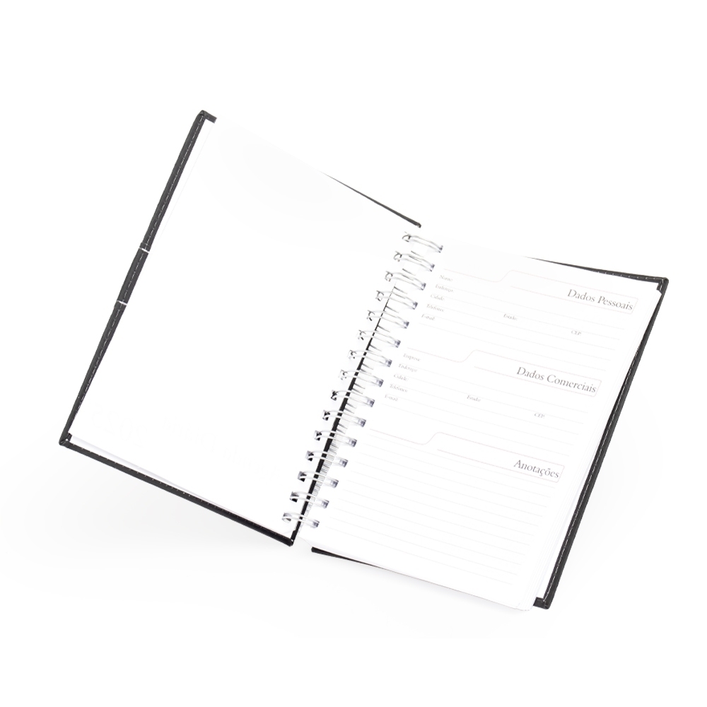 Agenda diária 2025 em couro sintético com wire-o. Possui “bolso” plástico, página para dados pessoais, calendário 2024 á 2026, mapa do Brasil, mapa global, índice telefônico e planejamento.