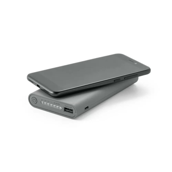 Bateria portátil em ABS com acabamento emborrachado que permite o carregamento do dispositivo por indução. Bateria de lítio com capacidade de 10.000 mAh e tempo de vida ≥ 500 ciclos. Com entrada/saída 5V/2.1A e potência de carregamento de 5W. Indicador de carga e portas USB, micro USB e USB tipo C. Incluso cabo USB/micro USB para carregar a bateria. Compatível com smartphones com tecnologia de carregamento sem fios. Fornecida em caixa presente. 135 x 75 x 20 mm | Caixa: 150 x 95 x 25 mm