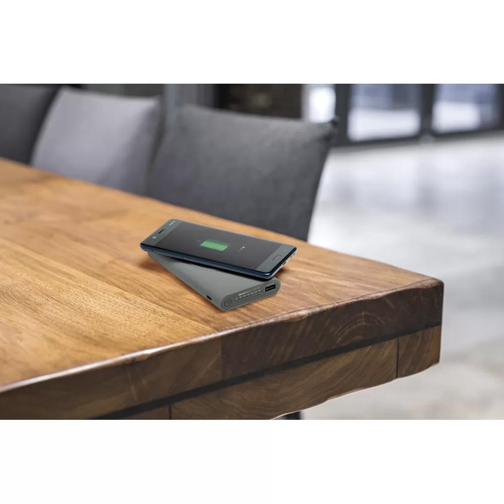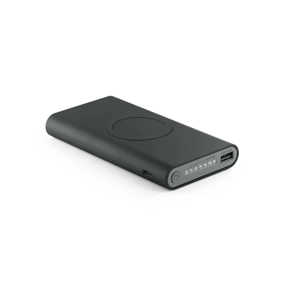 Bateria portátil em ABS com acabamento emborrachado que permite o carregamento do dispositivo por indução. Bateria de lítio com capacidade de 10.000 mAh e tempo de vida ≥ 500 ciclos. Com entrada/saída 5V/2.1A e potência de carregamento de 5W. Indicador de carga e portas USB, micro USB e USB tipo C. Incluso cabo USB/micro USB para carregar a bateria. Compatível com smartphones com tecnologia de carregamento sem fios. Fornecida em caixa presente. 135 x 75 x 20 mm | Caixa: 150 x 95 x 25 mm