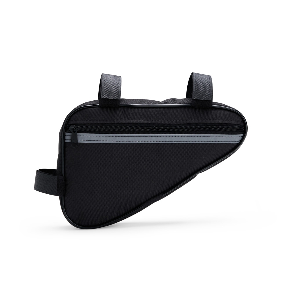 Esta bolsa para quadro é uma opção prática para carregar objetos enquanto estiver andando de bicicleta. Confeccionada em Oxford resistente e impermeável, a bolsa conta com único compartimento com fechamento em zíper, o que a torna ideal para armazenar objetos menores de forma eficiente, protegendo todo o conteúdo de seu interior contra a chuva e respingos dágua durante o trajeto. Conta com uma tira refletiva costurada para maior visibilidade no trânsito, além de alças de nylon com fechamento em velcro de fácil ajuste para o encaixe correto no quadro da bicicleta.