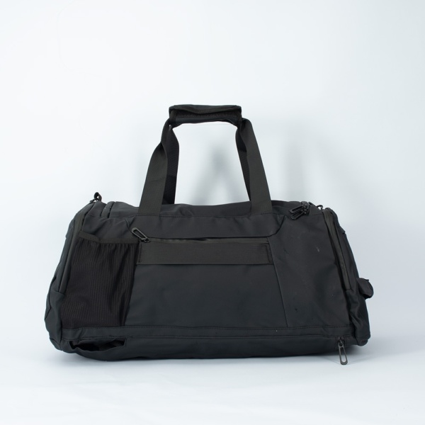 Bolsa em filme sintético tipo couro impermeável, com até 30 litros de capacidade após expansão inferior. Possui compartimento interno com bolso menor e outros quatro externos: um com botão magnético, um para calçados, um aberto e outro com zíper e encaixe para malas. Possui um par de alças laterais de mão e uma alça transversal removível.