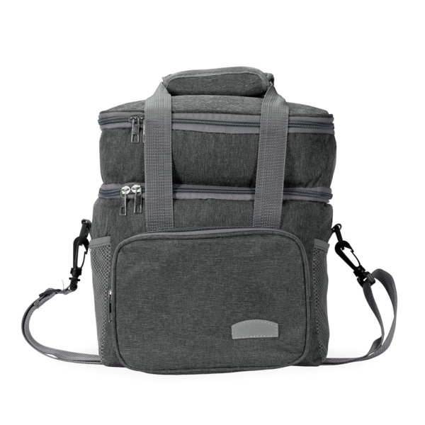 Bolsa térmica em Oxford resistente à água e capacidade máxima de 10 litros. Possui revestimento interno em PEVA, ideal para conservar a temperatura de alimentos e bebidas por mais tempo. Sua tampa apresenta revestimento térmico em folha de alumínio. Além disso, possui compartimento frontal externo e mais dois bolsos laterais em tela de nylon com elástico. Apresenta alças de mão com suporte de juntura e alça transversal removível.