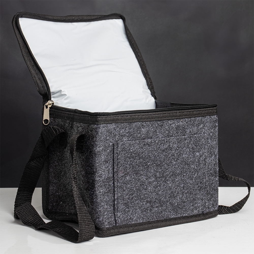 Bolsa térmica feita em feltro com capacidade para 5 litros, possui revestimento térmico, bolso frontal e alças para as mãos.