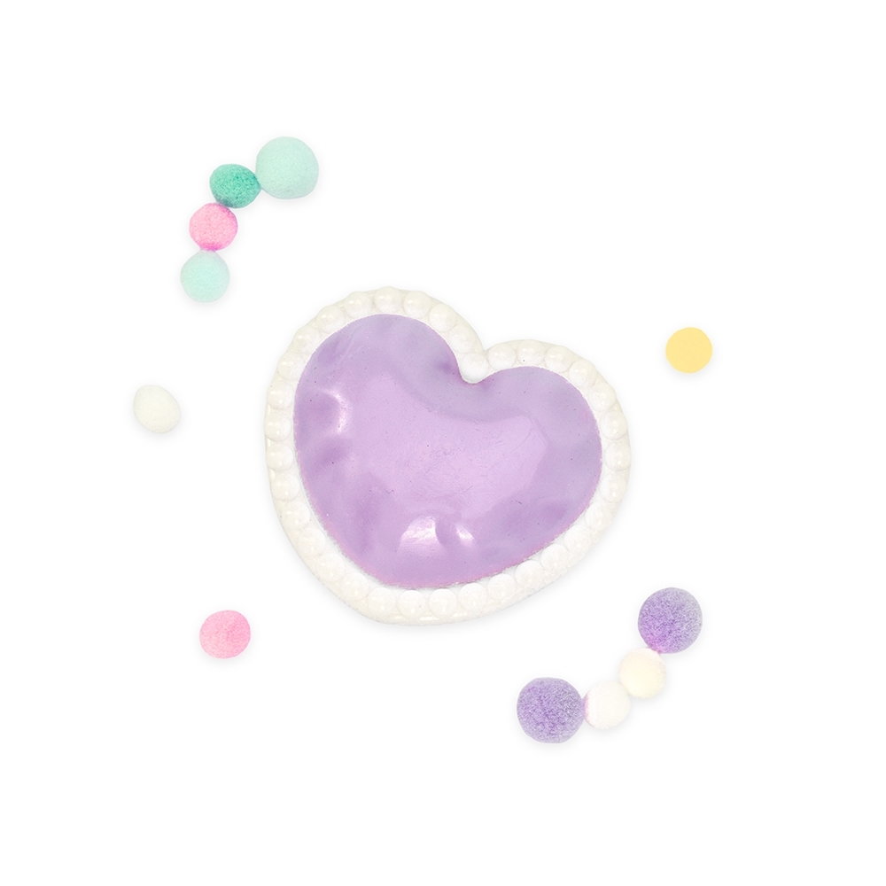 Brinquedo apertável antiestresse em formato de coração. Produzido em borracha termoplástica com superfície lisa e macia, adere facilmente a superfícies planas e acompanha bolinhas de pelúcia para decoração.