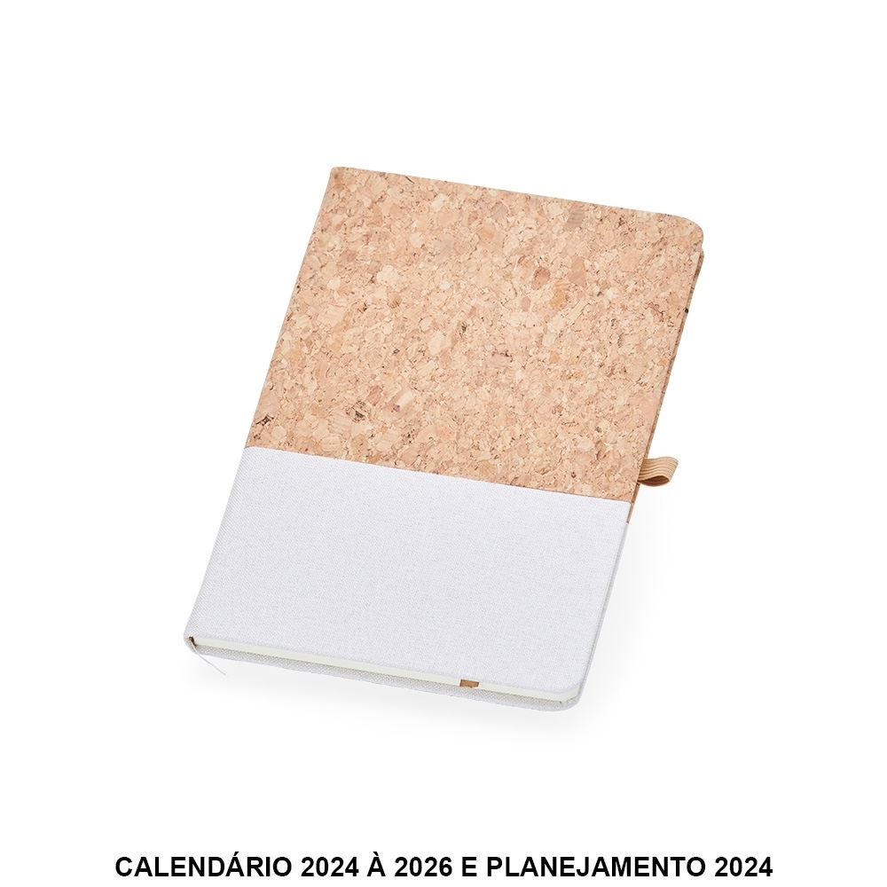 Caderneta A5 de cortiça com detalhe em linho e suporte para caneta, contém marcador de página em cetim, página para dados pessoais, calendário, páginas de planejamento e aproximadamente 92 folhas marfim com pauta. Obs.: Calendário 2024 à 2026 e planejamento 2024.