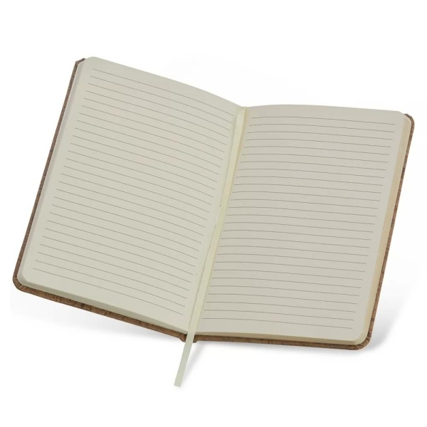 Caderneta em cortiça, possui marca página em cetim e elástico para lacre. Contém aproximadamente 80 folhas marfim pautadas.
