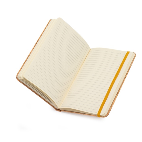 Caderneta em papel couche 150g, contém aproximadamente 72 folhas amarelas com pauta e 16 folhas sem pauta, marcador de página em cetim, elástico para lacre e compartimento em papel para documentos ou anotações.