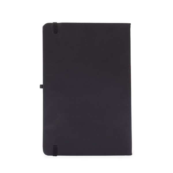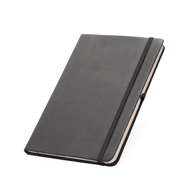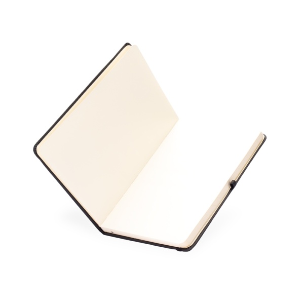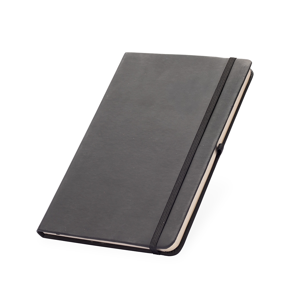 Caderneta de capa emborrachada com marca-páginas em cetim e elástico para fechamento. Possui cerca de 79 folhas levemente amareladas sem pauta.