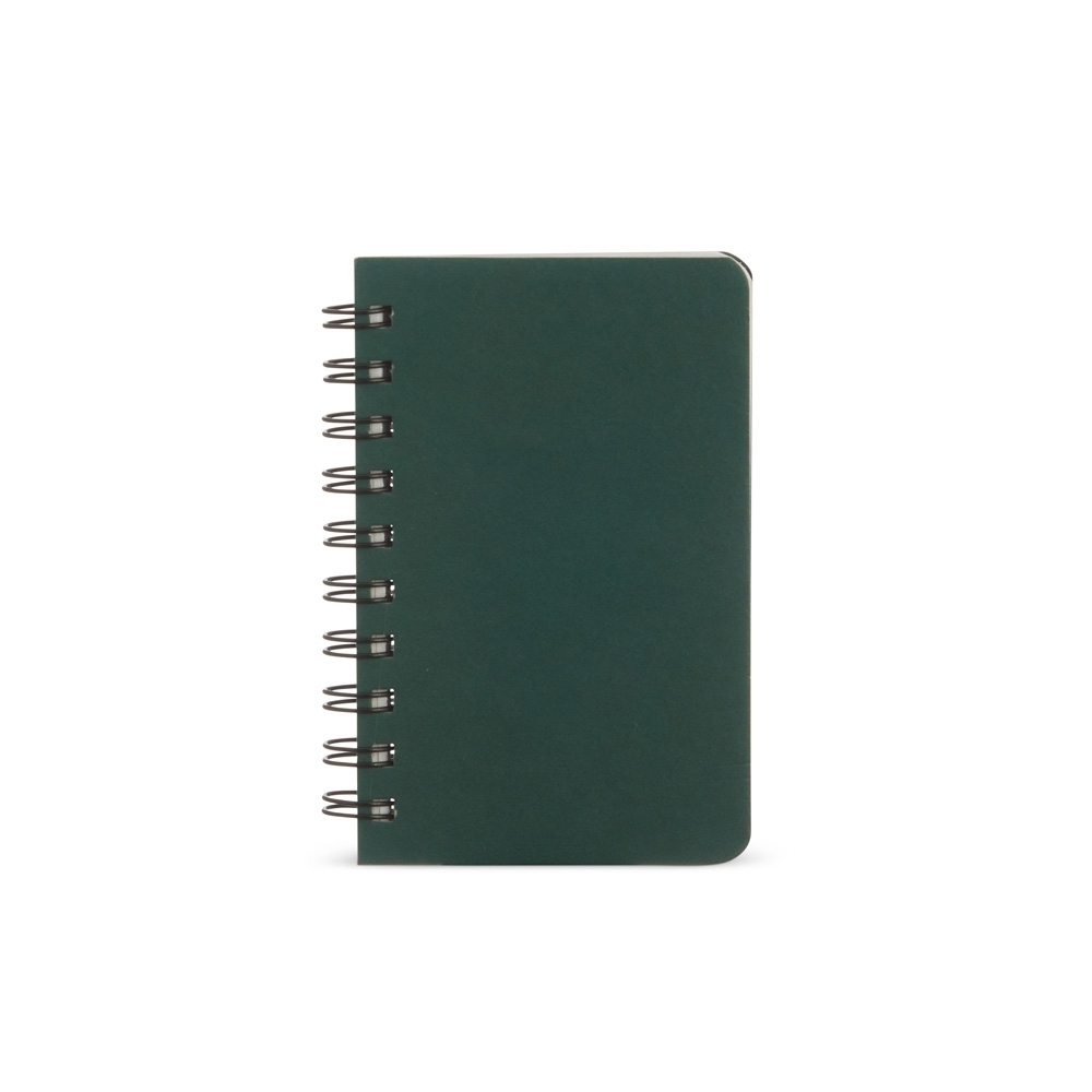 Caderneta capa dura em kraft com wire-o. Contém aproximadamente 100 folhas brancas sem pauta.