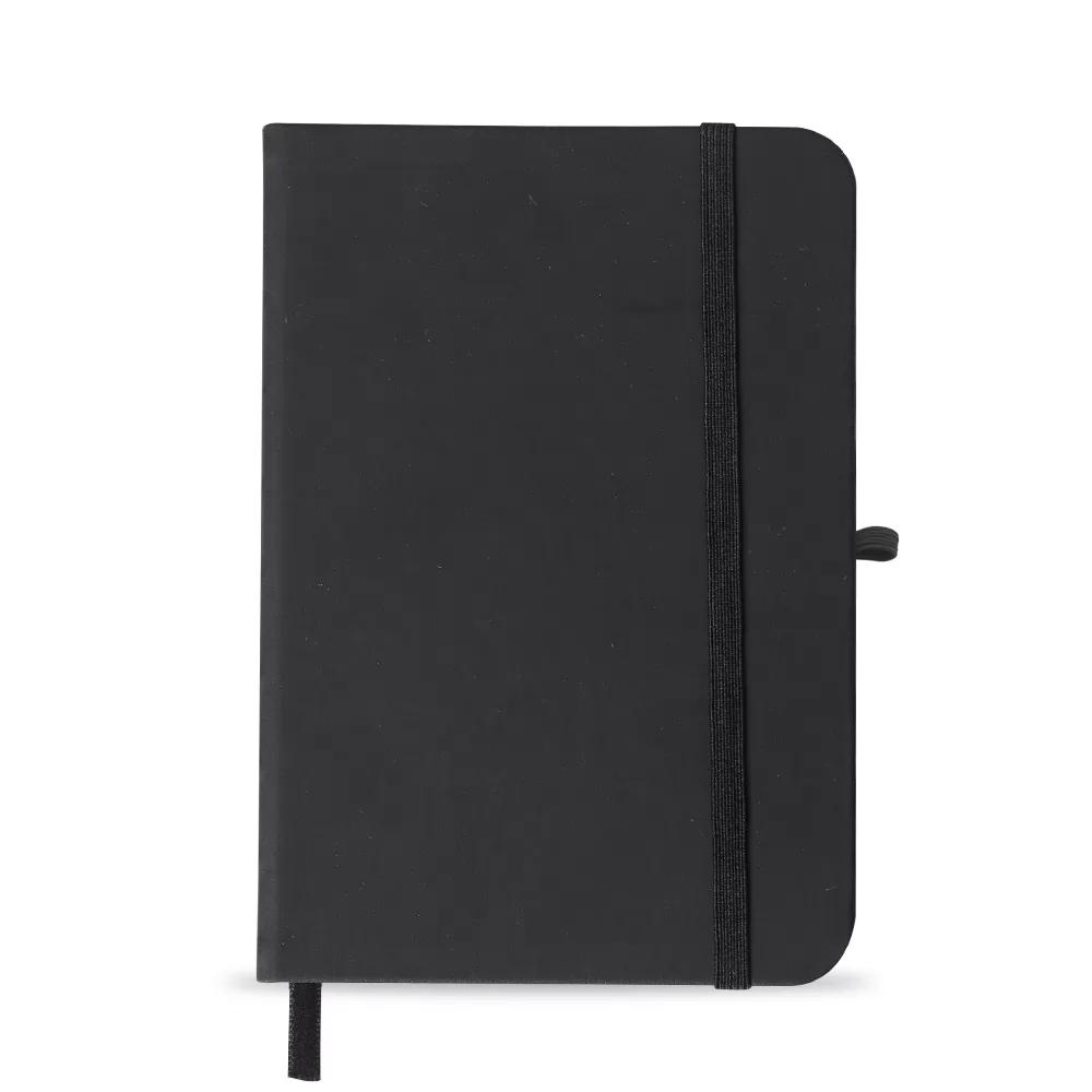 Caderneta tipo moleskine emborrachado de frente e verso liso, marcador de página em cetim, fita elástica para fechar e suporte elástico para caneta (não acompanha). Contém aproximadamente 80 folhas amarelas sem pauta.