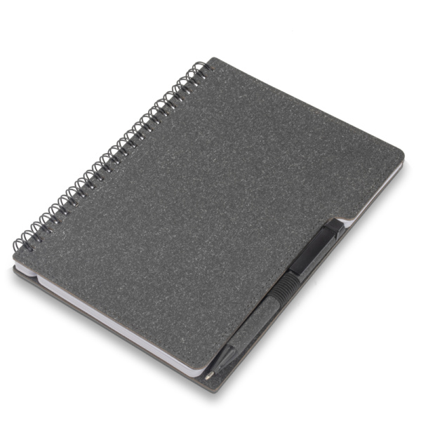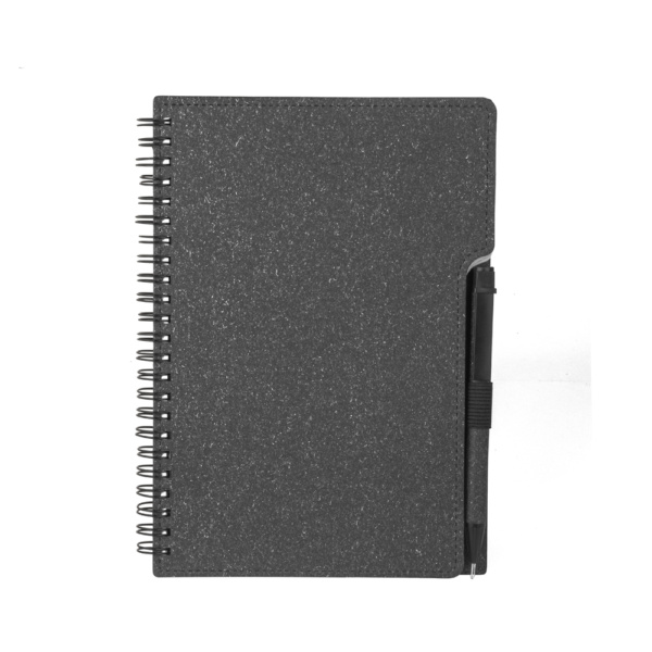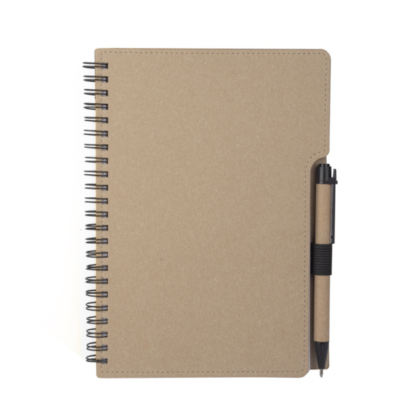 Caderno de anotações em papelão reciclável com suporte para caneta e miolo de 70 folhas pautadas e destacáveis.