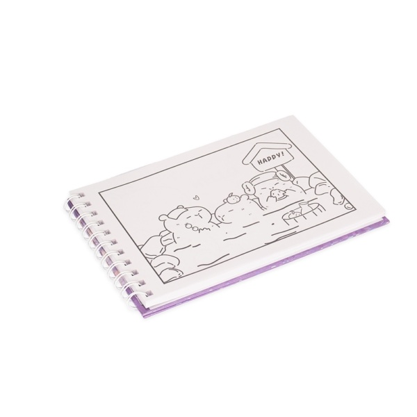 Caderno de colorir de capa dura com laminação holográfica e encadernação Wire-O. Possui aproximadamente 48 folhas com ilustrações de capivaras e outros animais em momentos leves e divertidos. Acompanha uma folha protetora destacável em acetato.