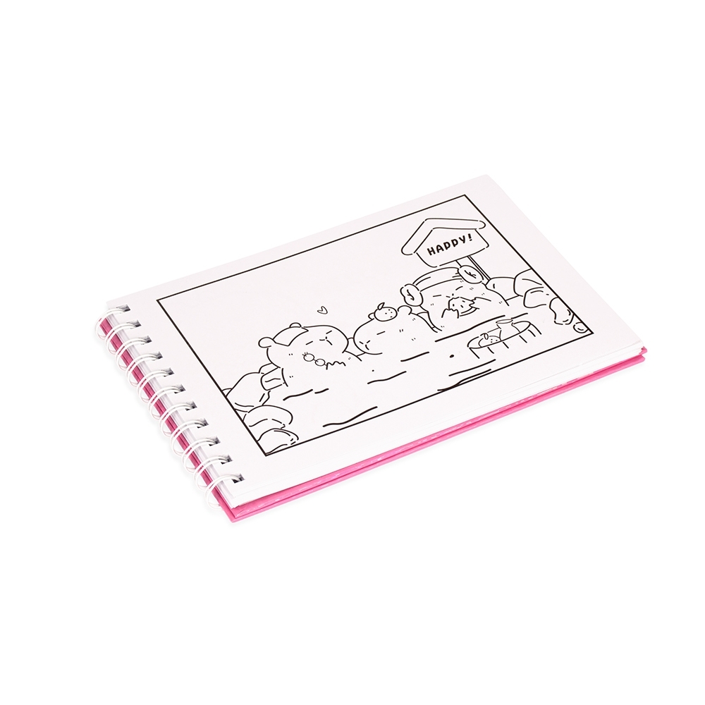Caderno de colorir de capa dura com laminação holográfica e encadernação Wire-O. Possui aproximadamente 48 folhas contendo ilustrações de capivara e outros animais em situações leves e divertidas. Acompanha uma folha protetora destacável em acetato.