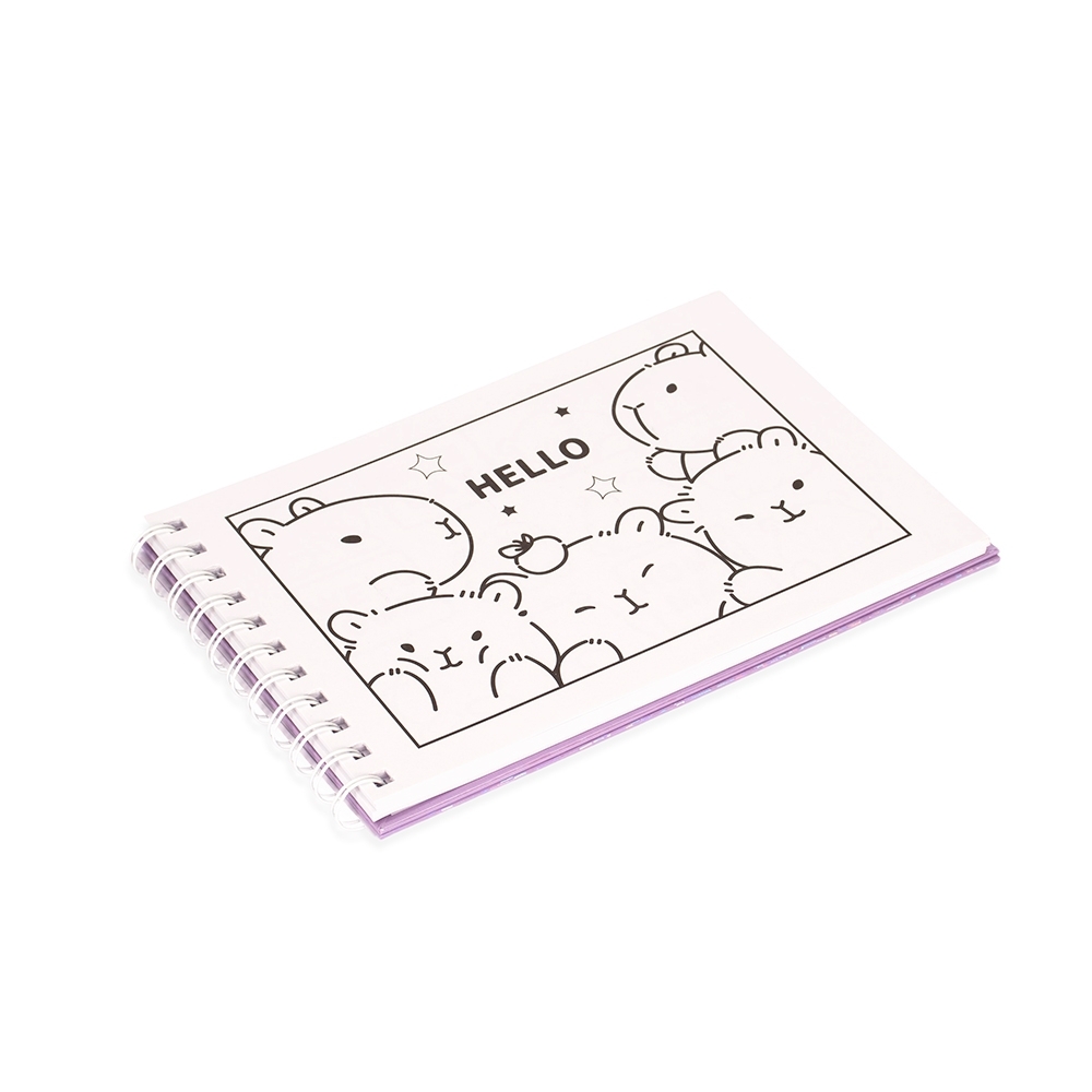 Caderno de colorir de capa dura com laminação holográfica e encadernação Wire-O. Possui aproximadamente 48 folhas contendo ilustrações de capivara e outros animais em situações leves e divertidas. Acompanha uma folha protetora destacável em acetato.