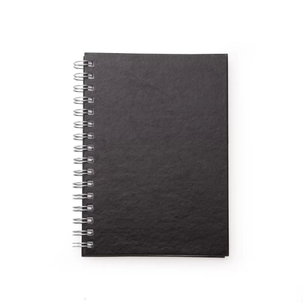 Caderno pequeno com capa de couro sintético texturizado e espiral prata metálico. Possui aproximadamente 96 folhas brancas pautadas e páginas para: dados pessoais, calendário de 2018 à 2021 e planejamento.