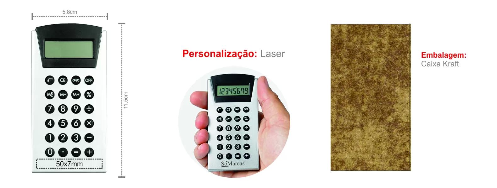 Confeccionada em polipropileno nas cores preta e prata, teclas emborrachadas e visor de 8 dígitos. Trabalha com as quatro operações básicas, raiz quadrada, porcentagem, memória com opção para acrescentar, subtrair e exibir números salvos. Bateria já inclusa. Dimensões do produto: 11,5×5,8×0,9cm. Embalagem: Caixa Kraft Dimensões da embalagem: 120x60x15 mm (AxLxP) Peso da embalagem: 50 g