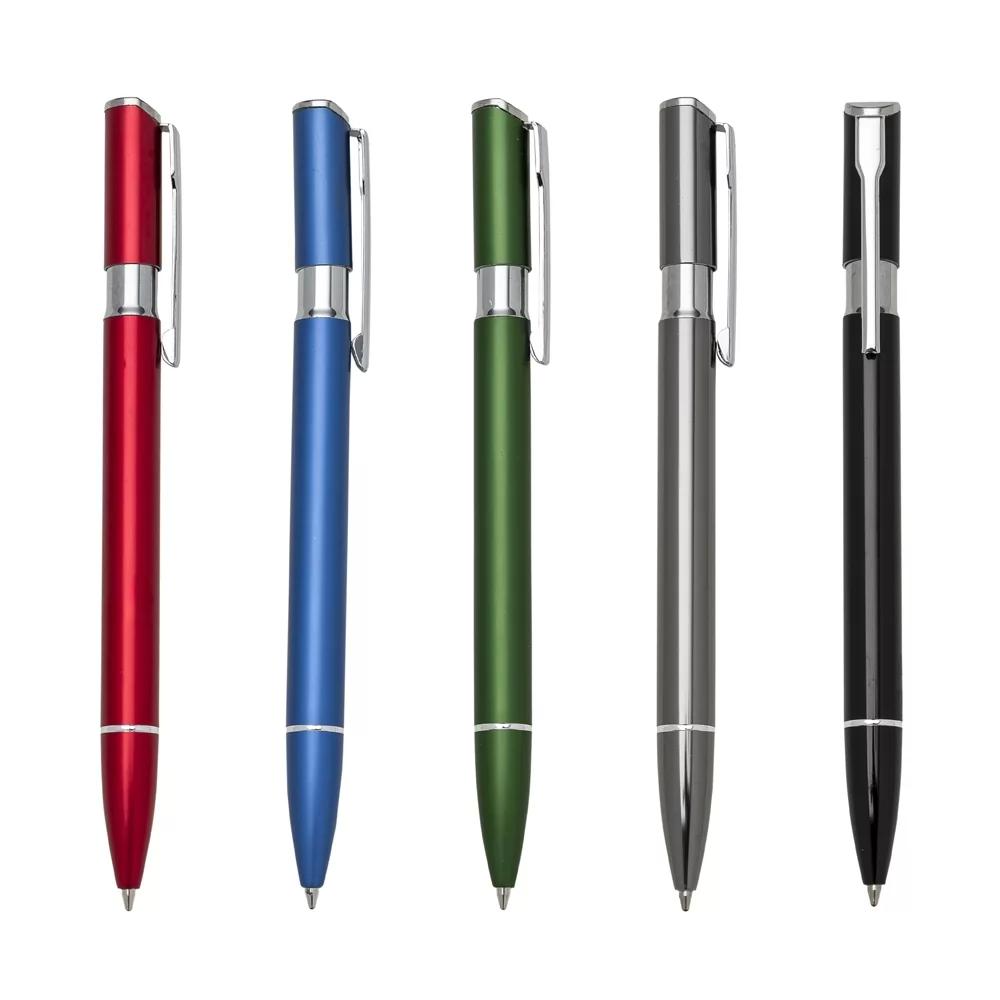 Caneta alumínio inteira colorida com detalhes prata. Possui clip de metal, parte superior e ao redor do clip detalhe prateado. Possui anel inferior prata e aciona por clique.