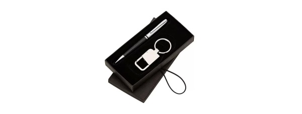 Conjunto com caneta e chaveiro. Conta com caneta em Metal / Material Sintético com carga esferográfica azul; chaveiro em Metal com mosquetão. Dimensões do produto: CHAVEIRO: 8 X 2,5 X 0,6 CMPESO: 30 GRAMASCANETA: 13 X ø 1,2 CMPESO: 20 GRAMASCAIXA: 16,5 X 8 X 2,5 CMPESO: 30 GRAMAS Embalagem: Caixa Preta Dimensões da embalagem: 165x80x25 mm (AxLxP) Peso da embalagem: 80 g