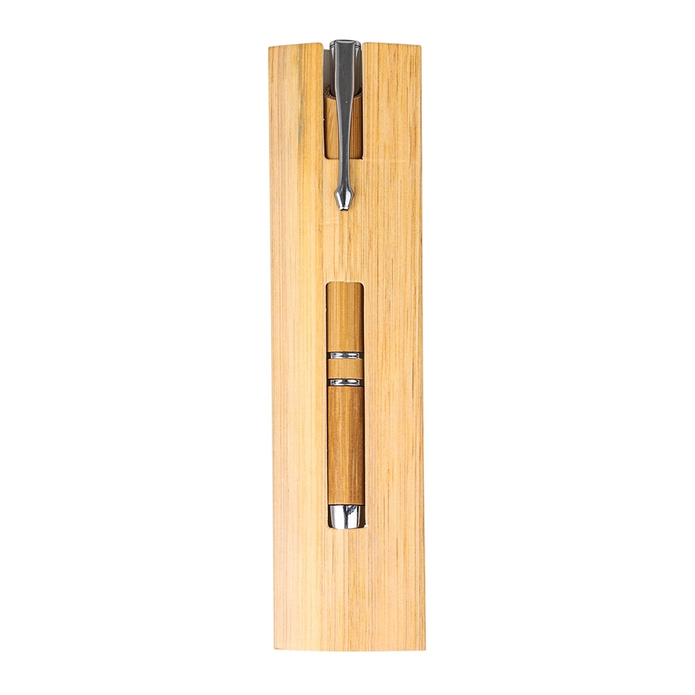 A nossa caneta ecológica de bambu é a opção perfeita para acompanhar uma rotina repleta de registros. Com um design elegante, ela conta com clipe metálico, carga esferográfica azul de 1.0mm e acionamento por clique, unindo praticidade e sustentabilidade. Para torná-la ainda mais exclusiva, acompanha um estojo de papel com estampa que imita bambu.