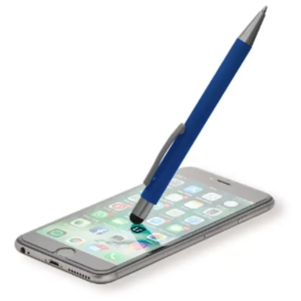 Caneta esferográfica em alumínio azul. Conta com acabamento fosco, clipe e ponteira touch em silicone preto. Carga esferográfica azul acionada por um click na extremidade da caneta.