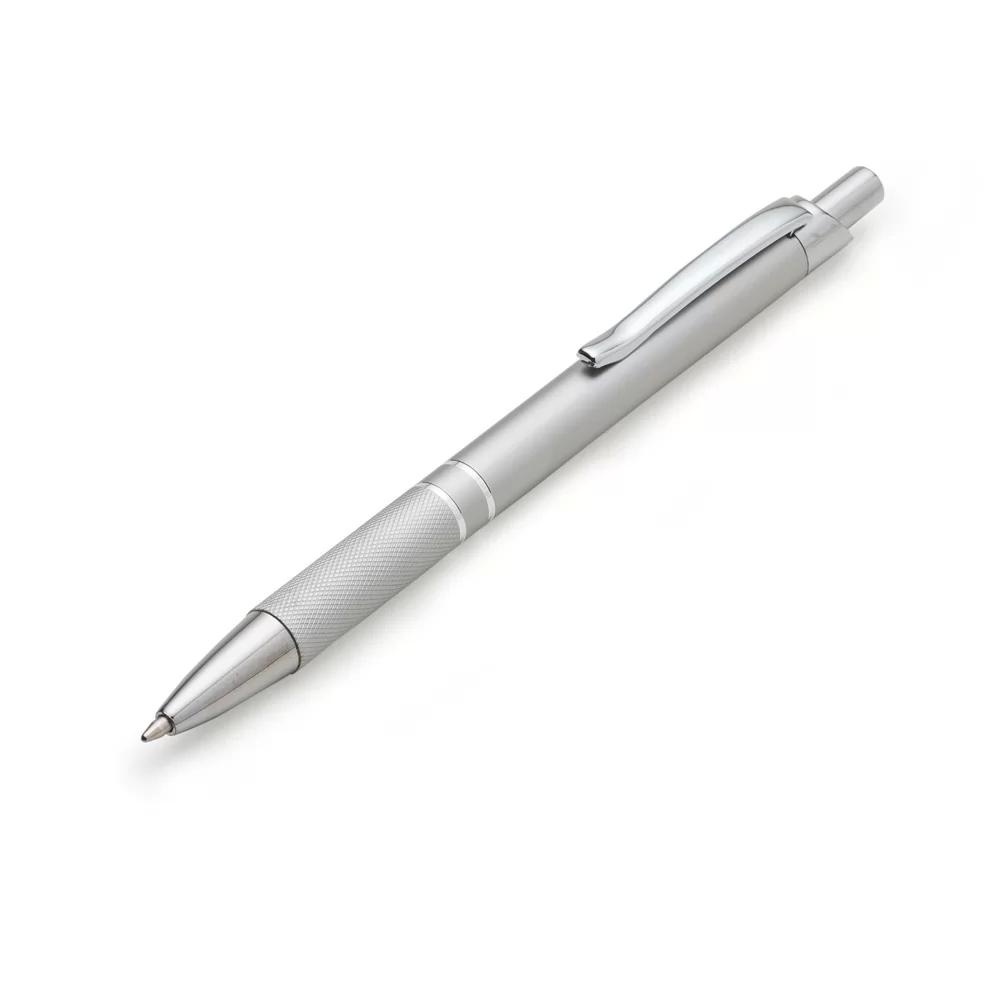 Caneta metal inteira colorida com detalhes prata. Clip metal, possui dois anéis prata inferior e abaixo detalhe texturizado. Aciona por clique.