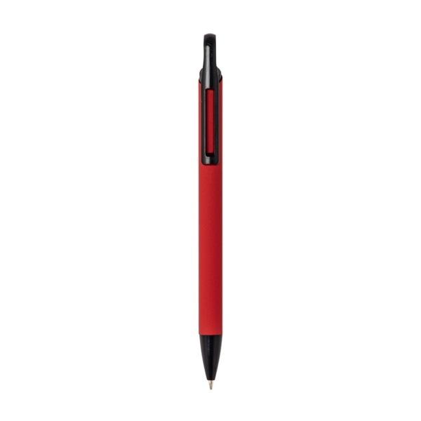 Caneta metálica com acabamento similar à borracha, carga esferográfica azul 1.0mm e acionamento por clique.