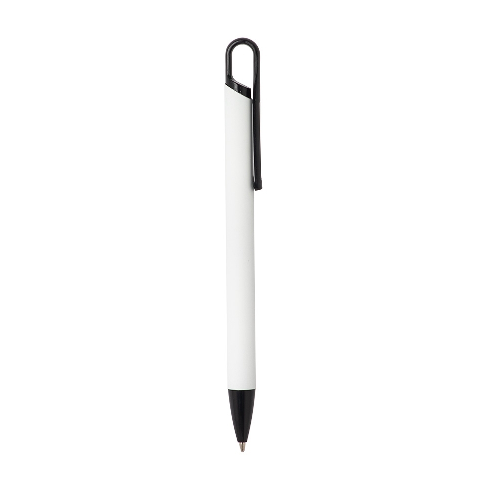 Caneta metálica com acabamento similar à borracha, carga esferográfica azul 1.0mm e acionamento por clique.