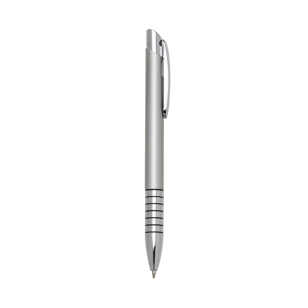 Caneta metálica com carga esferográfica azul e acionamento por clique.