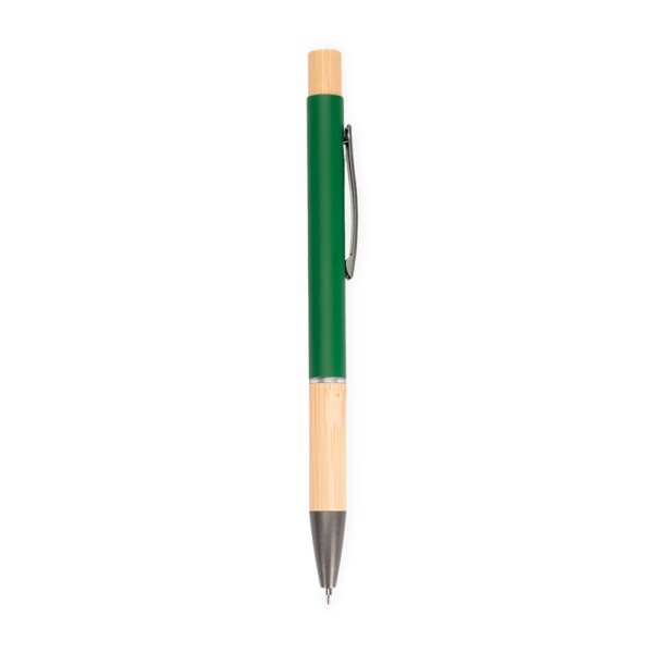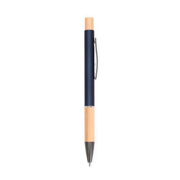 Caneta com carga esferográfica azul de 1.0mm. Apresenta corpo metálico, detalhes em bambu e acionamento por clique, oferecendo uma pegada leve para uma escrita precisa.