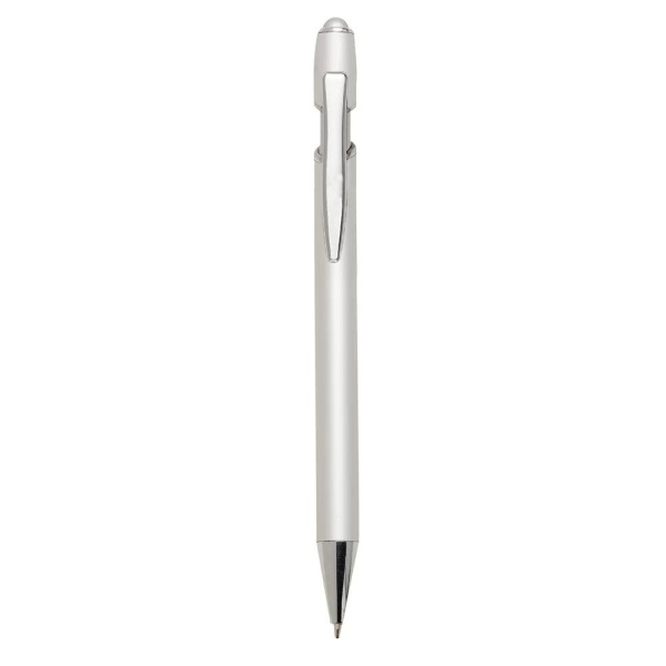 Caneta metal com ponteira touch. Corpo com pintura prata fosco, acionador com borracha touch e clip metálico com detalhe brilhante. Aciona por clique.
