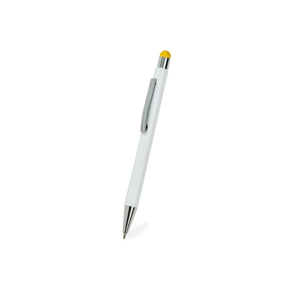Caneta metálica com touch screen, carga esferográfica azul e acionamento por clique.