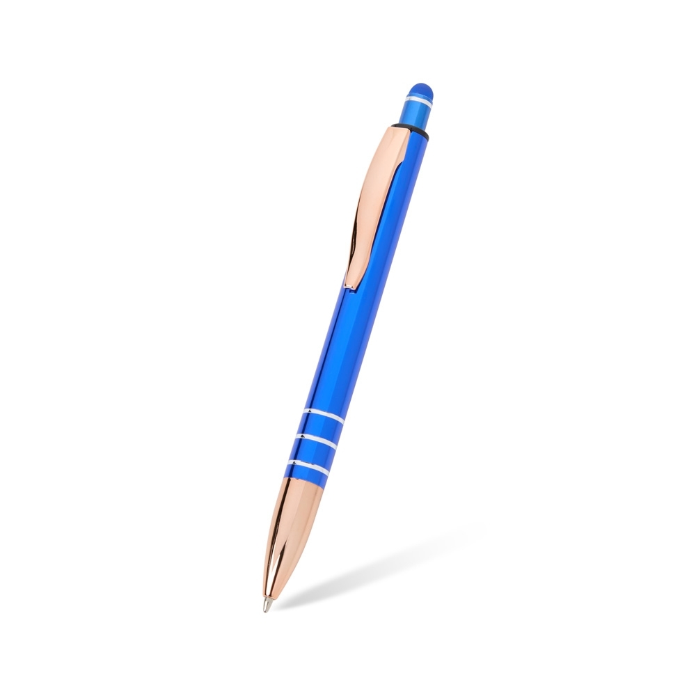 Caneta metálica com acionador touch, clipe metálico e ponteira plástica. Carga esferográfica azul 1.0mm e acionamento por clique.