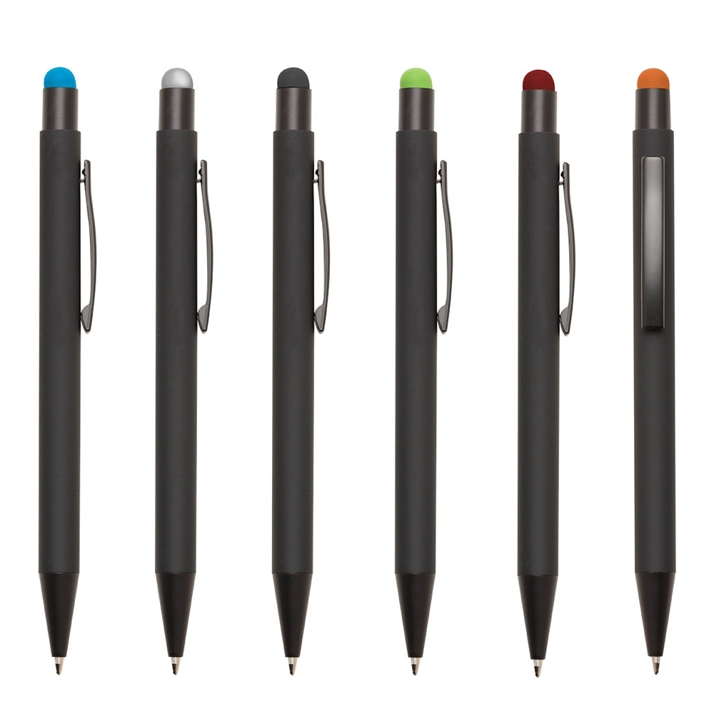 Caneta metálica com touch screen, carga esferográfica azul e acionamento por clique.