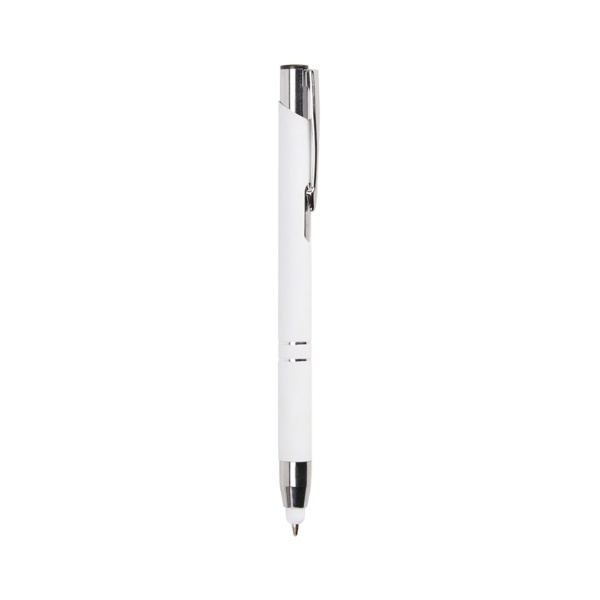 Caneta esferográfica com carga azul de 1.0mm e acionamento por clique. De construção metálica, também possui ponteira emborrachada que permite seu uso como uma caneta touch para interação com dispositivos de tela sensível ao toque.