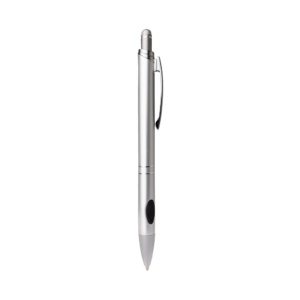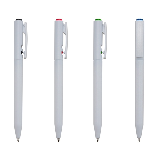 Caneta plástica com carga esferográfica azul 1.0 mm e acionamento por clique.