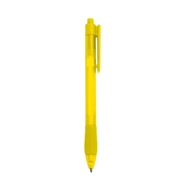 caneta plástica translúcida colorida com detalhe inferior emborrachado. Aciona por clique.
