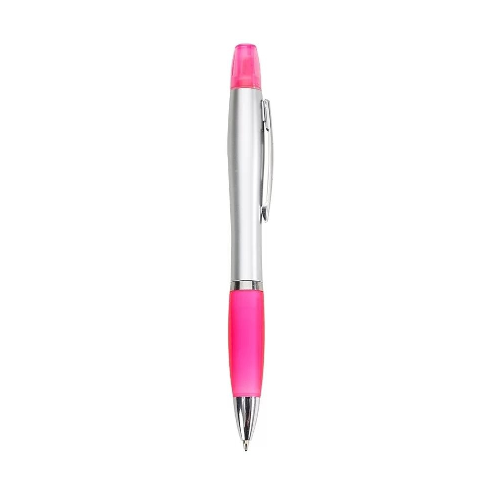 Caneta plástica com marca texto, contém detalhe emborrachado e tampa protetora para o marca texto. Carga esferográfica azul e acionamento por rotação.