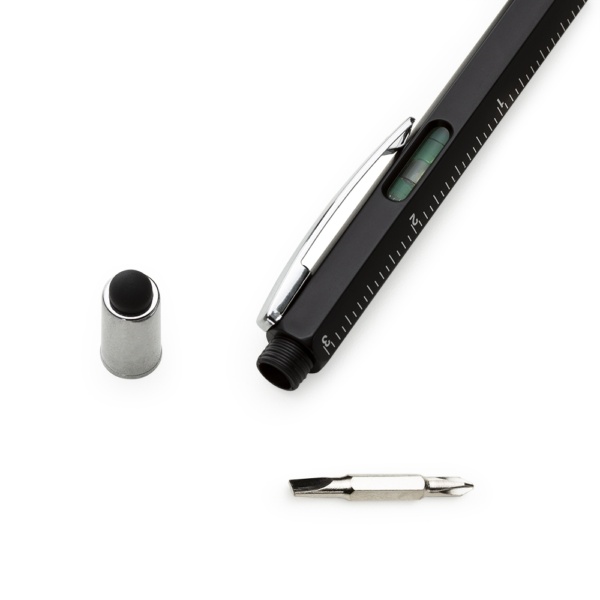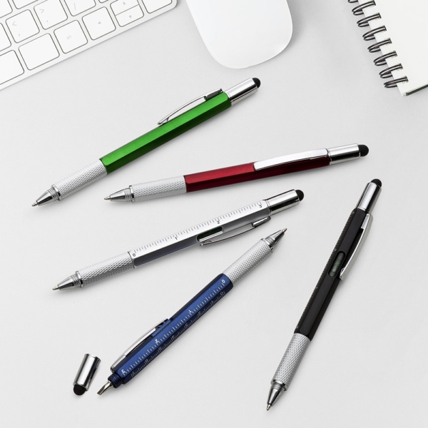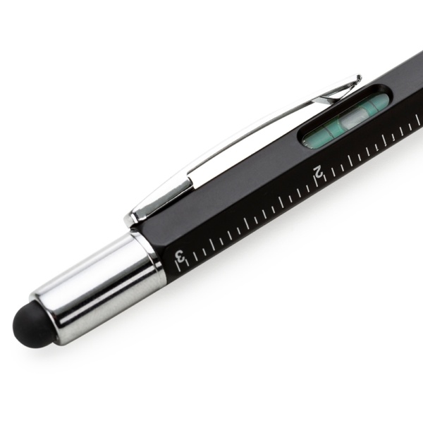 Caneta plástica multifunções, contém réguas com medição em centímetros (alcance 7cm) e polegadas (alcance 3pol), medidor de nível e compartimento superior touch screen com duas mini chaves: Philips e Fenda. Carga esferográfica azul e acionamento por rotação.