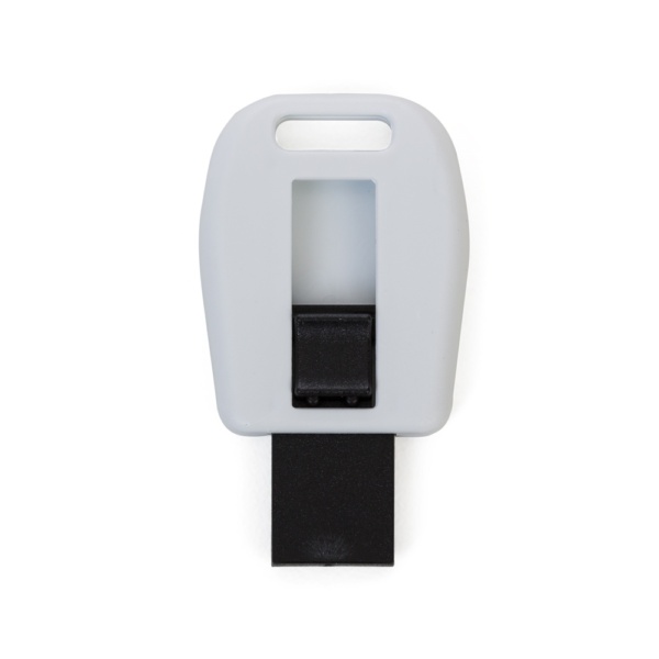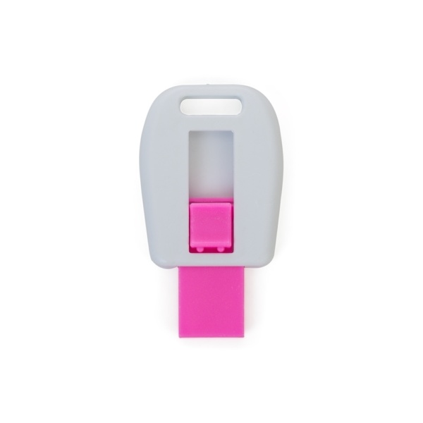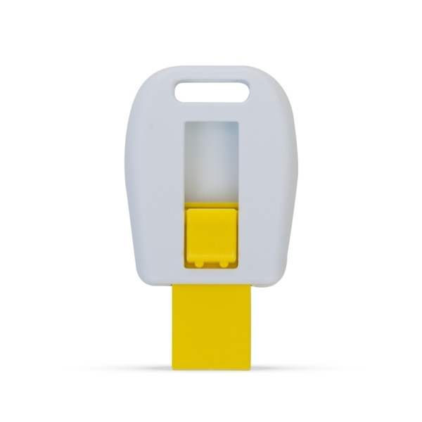 Carcaça retrátil plástica para memória COB. Possui parte superior vazada para encaixe de cordão/argola, botão/acionar colorido e verso com área lisa.