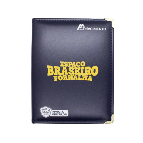| Características | • Produto Artesanal Fabricado no Brasil • Pasta Revestida em Couro Sintético • Costurado • Almofadado • 4 parafusos de metal • Cantoneiras de metal |
