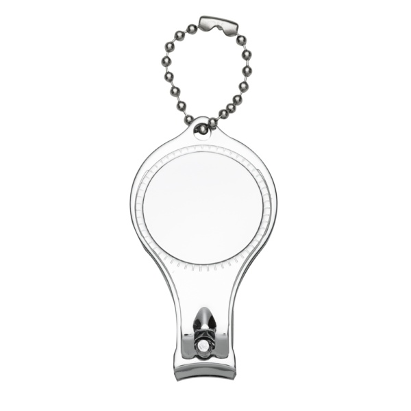 Chaveiro metal 3 em 1: abridor, cortador e lixa. Parte central circular ideal para gravações, detalhe de traços no contorno circular. Lado frontal com detalhes em relevo nas laterais e pequeno círculo acima do abridor. Para utilizar o cortador basta rotacionar a peça cirular e levantá-la. Acompanha correntinha.